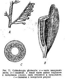 У Goldenbergia glomerata, например, (рис. 71) такой плод представлял собой овальное тело около 6тАФ8 -мм длиной, сидящее на длинной тонкой ножке (10тАФ15 мм). Внутри тАвего находилась обширная полость, а стенка была построена из вегетативной ткани, в толще которой заключалось 12тАФ18 трубчатых спорангиев. Они располагались в один ряд вокруг центральной полости и содержали в себе довольно крупные микроспоры (0,3тАФ0,4 мм). Внешняя поверхность плода была покрыта короткими шипиками.