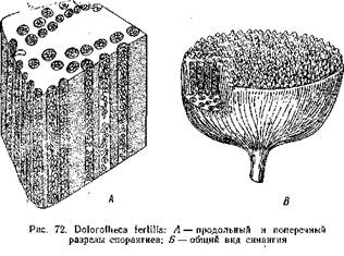 Подобное же строение имели и синангии Aulotheca. У Whittleseya elegans синангии имел форму бокала на тонкой ножке. Стенку бокала образуют сросшиеся между собой трубчатые спорангии с очень толстыми стенками. Dolorotheca мела чашевидные синангии, причем полость чаши была заполнена вегетативной тканью, в которую были вкраплены трубчатые спорангии (рис. 72). Т. Галле, подробно изучивший плодоношение Whittleseyinae, считает, что синангии их могли возникнуть путем тангентальвого сращения трубчатых спорангиев, подобно тому, как листья могли возникнуть ив дихотомически разветвленных теломов благодаря срастанию и с краями в одной плоскости.