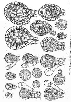 Это плодоношение типа Codonotheca. Далее срастание спорангиев идет до их вершин, получается бокаловидный синангии, как у Whittleseya elegans. Наконец, спорангии смыкаются и срастаются своими вершинами тАФобразуется плод, полый внутри со спорангиями, находящимися в его стенкетАФAulotheca, Goldenbergia.