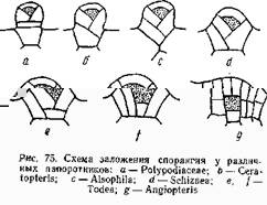 Лептоспорангиатный тип развития спорангия характеризует типичные папоротники (пор. Filioales). Он отличается тем, что спорангий здесь возникает из одной эпидермической клетки, и сам спорангий имеет однослойную стенку и относительно малые размеры. Развитие его происходит по следующей схеме (рис. 74).