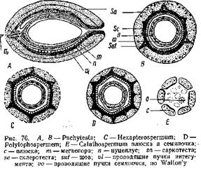 При этом интересно отметить, что число этик образований и в группе Lagenostomales и Trigonocarpales обычно кратно трем. У Calathospermqm плюсна состоит из 6 отдельных частей, окружающих мегаспорангии. У Hexapterospermum и Polylophospermum части эти срастаются и образуют общий покров, достигающий значительной толщины и дифференцирующийся натри Слоя тАФ наружный мясистый (sarcotesta), второй тАФ каменистый (solerotesta) и внутренний тАФ тонкостенный. В местах сращения на склерютесте возникли ребра, вдающиеся в саркотесту (рис. 76). Этот покров семян Trigonacarpales соответствует плюске- Lagenostoma, а собственно интегумент, хорошо выраженный у Lagenostoma и свободно лежащий в плюске, в семенах Trigonocarpus срастается с сильно редуцированным нуцеллусом, образуя то, что называют у него нуцеллусом. И у Trigonocarpus и у Lagenostoma в семени находится только один мегаспорангии. Таким образом, Trigonocarpus по сравнению с Lagenostoma отличается более простым строением, и оба он более просты по сравнению с Caiiathospermum, у которого в купле находится несколько мегаслорангиев. Эволюция в семенах Pteridospermae шла, по мнению С. Уольтона, в направлении редукции числа мегаепорамгиев и упрощения строения их. Это упрощение выражается и в устройстве вершины нуцеллуса, довольно "сложного у Lagenostoma.