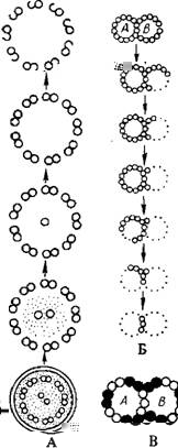 А последовательность растворения микротрубочек жгутика: удаление мембраны жгутика оставляет нетронутой аксонему. содержащую девять наружных дублетов и две центральные трубочки. При обработке аксонемы возрастающими концентрациями саркозила удаляется одна из центральных трубочек, затем растворяется оставшаяся центральная трубочка, часто вместе с наружной частью трубочки В. Б- интактные наружные дублеты растворяются в такой последовательности: наружная часть трубочки В, оставшаяся часть трубочки В, наружная часть трубочки А, АтАУостаток трубочки А, за исключением грех первичных нитей, составляющих перегородку между трубочками А и В. В схема, иллюстрирующая гипотетическое расположение тубулина 1 и тубулина 2 в наружном дублете.