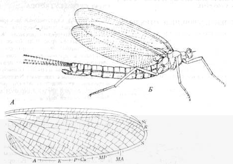 Находки ископаемых насекомых, принадлежащих четырем вымершим и двум современным отрядам Paleoptera, свидетельствуют о том, что два выживших отряда - Ephemeroptera (поденки; рис. 13, А и Б) и Odonata (стрекозы) - это всего лишь остатки древней и очень разнообразной фауны крылатых насекомых Пенсильвания. Современные отряды представляют собой две разошедшиеся ветви Paleoptera. У Ephemeroptera способность к полету как на преимагинальной, так и имагинальной стадии развития, а также редукция ротового аппарата у этих стадий, произошедшая в послепалеозойское время, говорят об их давнем отделении от других Paleoptera.