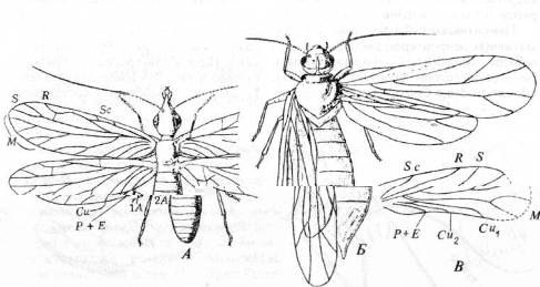 Рис. 5. Отряд Megasecoptera. Переднее (А) и заднее (Б) крылья Aspidothoraxtriangularisиз позднего карбона Европы. (По Carpenter.) В. Pseudohymenangustipenni: из нижнепермских отложений Урала. (Из Родендорфа и др.)