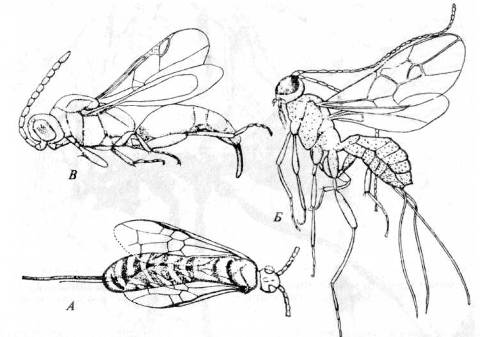 Рис. 21. Отряд Hymenoptera. A. Anaxyela gracilis (подотр. Symphyta из юрских отложений в Казахстане). Б. Microtypuslongicornis(подотр. Apocrita, надсем. Ichneumonida) из эоценового балтийского янтаря; В. Cryptoserphuspinorus(сем. Proctotrupidae) из эоценового балтийского янтаря. (Из Родендорфа и др.)