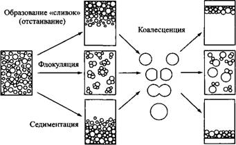 Рис. 1. Механизмы дестабилизации эмульсий. Обратите внимание, что различные процессы могут происходить одновременно