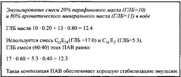 В процессе эмульгирования эмульгатор или комбинация эмульгаторов должны быть выбраны с числом ГЛБ, равным числу ГЛБ фазы, которую нужно эмульгировать. При использовании смесей ПАВ ее ГЛБ определяется как средневзвешенное число из чисел ГЛБ индивидуальных ПАВ. Пример использования метода ГЛБ для выбора эмульгатора приведен на рис. 7.