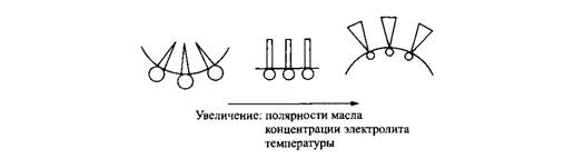 Электронные эффекты не настолько вездесущи, как эффекты геометрической упаковки. Донорно-акцепторные комплексы могут возникать только в том случае, если масло содержит компоненты, способные выступать как акцепторы электронов. Такими компонентами могут быть олефины и ароматические соединения, особенно содержащие группы, способные оттягивать электроны. Множество пищевых эмульсий, как и многие технические эмульсии, содержат масла с ненасыщенными компонентами. Образование комплексов способствует усилению взаимодействия между эмульгатором и масляной фазой. В свою очередь это позволяет использовать поверхностно-активные вещества с немного более длинными полиоксиэтиленовыми цепями, чем обычно. Более длинные оксиэти-леновые цепи обеспечивают более высокую растворимость поверхностно-активного вещества в воде. Такие ПАВ, не дающие дополнительного вклада в гидрофобные взаимодействия неполярных радикалов с маслом, преимущественно находятся в водной фазе. Использование поверхностно-активных веществ с более длинными оксиэтиленовыми цепями выгодно, поскольку такие цепи обеспечивают сильное стерическое отталкивание между каплями, предотвращая их коалесценцию.