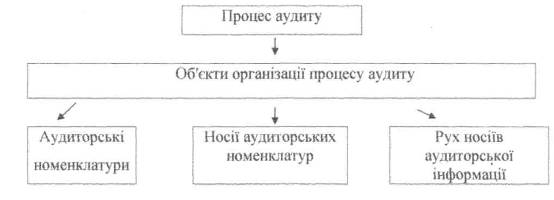 Така структура процесу зовнiшнього аудиту визначаi змiст об'iктiв його органiзацii до яких вiдносять; аудиторськi номенклатури, носii аудиторських номенклатур, рух носiiв аудиторськоi iнформацii i iнформацiйне забезпечення процесу аудиту (рис. 1.6)