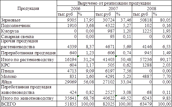 Рассмотрим структуру товарной продукции в ООО ВлАгрофирмаВ» в 2006 тАУ 2008 гг в таблице 1.4.