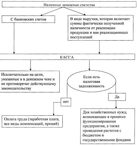 Наличная выручка предприятия полученная от реализации товаров (работ, услуг), и другие кассовые поступления могут использоваться в необходимых размерах для обеспечения хозяйственных нужд, в том числе и на выплаты, связанные с оплатой труда и выплатой дивидендов (доходов). В этих целях могут использоваться и наличные деньги, полученные в банке. При этом предприятие должно обеспечивать систематическую и полную оплату налогов и внесение обязательных платежей в государственные целевые фонды в порядке и сроки, предусмотренные действующим законодательством.