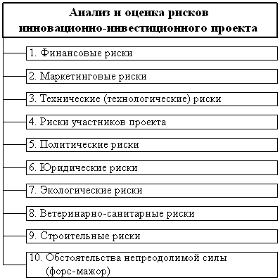 Из рис.2 видно, что общую совокупность рисков освоения инвестиционных проектов можно разделить на 10 видов: 1) финансовые риски; 2) маркетинговые риски; 3) технические (технологические) риски; 4) риски участников проекта; 5) политические риски; 6) юридические риски; 7) экологические риски; 8) ветеринарно-санитарные риски; 9) строительные риски; 10) риски, связанные с форс-мажорными обстоятельствами.