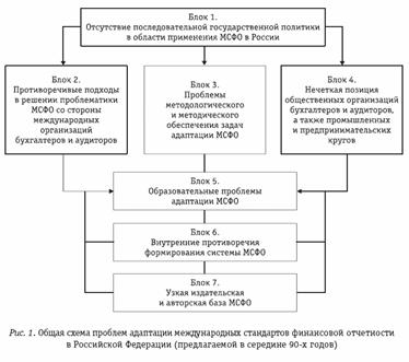 В середине девяностых годов была предпринята одна из первых попыток систематизации проблем адаптации международных стандартов финансовой отчетности в Российской Федерации. Еще тогда отмечалось, что проблематика привязки МiО к нашим условиям связана с решением целого ряда задач, которые требуют хотя бы предварительной систематизации. И тогда же была предпринята попытка формирования общей блок-схемы проблем адаптации МiО в России. Было выделено семь групп (блоков) проблем (рис. 1).