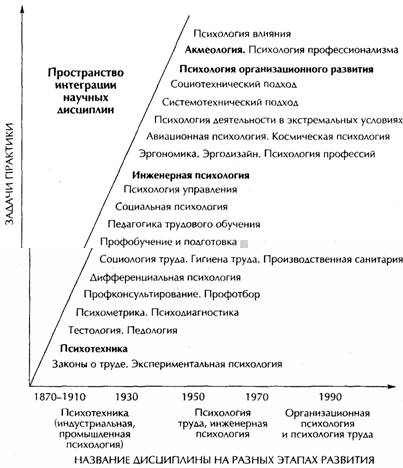Сложные взаимосвязи психологии труда с другими ветвями психологии, во многом обусловленные запросами социальной практики, можно представить в виде хронологической схемы, отражающей изменения и обогащение содержания самой дисциплины