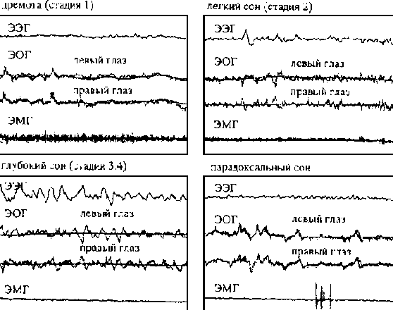 ВаНа приведенных диаграммах видно, что для смены стадий медленного сна характерно постепенное увеличение амплитуды и снижение частоты волн ЭЭГ, смена быстрых движений глаз медленными, вплоть до полного исчезновения; прогрессивное уменьшение амплитуды ЭМГ. При парадоксальном сне ЭЭГ такая же, как при бодрствовании, ЭОГ демонстрирует быстрые движения глаз, а ЭМГ почти не регистрируется.