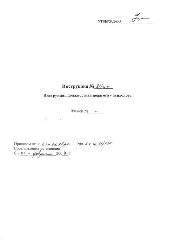 Далее я познакомилась с организацией в данном детском учреждении работы психолога. Педагог-психолог МДОУ №26 ВлЭрудитВ» - Силина Ирина Викторовна, в своей работе руководствуется должностной инструкцией (Приложение 1).