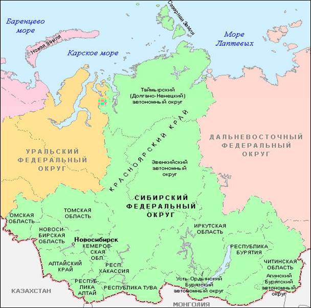 В состав Сибирского федерального округа входят республики: Алтай, Бурятия, Тува и Хакасия; Алтайский и Красноярский края; Иркутская, Кемеровская, Новосибирская, Омская, Томская, ЧитинВнская области; Агинский Бурятский, Таймырский (Долгано-Ненецкий), Усть-Ордынский Бурятский и Эвенкийский автономные округа.