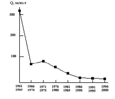 Среднесуточные дебиты нефтяных скважин снизились по основным разрабатываемым месторождениям со 150 т в 1970 г. до 43 т в 1985 г. и до 10 т в 1990 г.