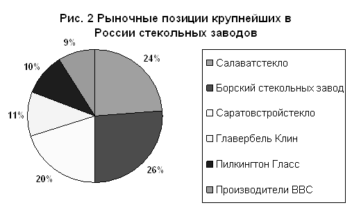 Крупнейшими компаниями отрасли являются ВлБорский стекольный заводВ» (AGC БСЗ), ВлСалаватстеклоВ», ВлСаратовстройстеклоВ». Кроме того, активно наращивает выпуск продукции, укрепляя своё положение на рынке, стекольный завод в г. Клин Московской области, построенный компанией Glaverbel. В начале 2006 года компания Pilkington запустила завод по выпуску флоат-стекла в г. Раменское Московской области. Мощность завода составляет порядка 240 тыс. т., однако доли этих заводов на рынке пока находятся на уровне 10% от общего объёма рынка.