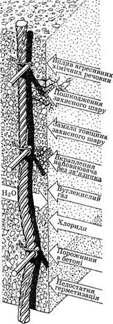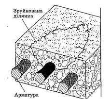 Внаслiдок корозii сталi збiльшуiться об'iм, що призводить до виникнення внутрiшнього тиску в конструкцii i перших трiщин, якi зi часом прискорюють корозiю i вплив iнших чинникiв вивiтрювання, а також спричинюють руйнування i вiдшаровування поверхневого) шару над арматурою (рис. 2.1.).
