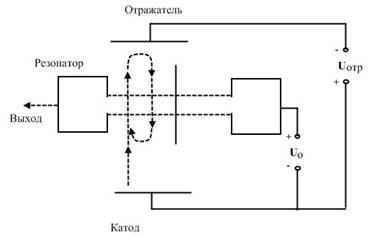 Чтобы обеспечить выполнение обеих функций, необходимо вернуть в резонатор электронный поток, прошедший через сетки резонатора при движении от катода. Поток поворачивают с помощью отражателя, имеющего отрицательный потенциал Uотр по отношению к катоду.
