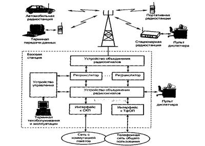 Необязательными, но характерными элементами ТСР являются диспетчерские пульты (ДП). ТСР используются в первую очередь потребителями, работа которых требует наличия диспетчера - службы охраны, скорая медицинская помощь, пожарная охрана, транспортные компании, муниципальные службы. ДП могут включаться в систему по абонентским радиоВнканалам, или подключаться по выделенным линиям непосредственно к коммутатору БС. В рамках одной ТСР может быть организовано несколько независимых сетей связи. ПользоваВнтели каждой из таких сетей не будут замечать работу соседей и не смогут вмешиваться в раВнботу других сетей. Поэтому в одной ТСР могут работать несколько ДП, различным образом подключенных к ней.