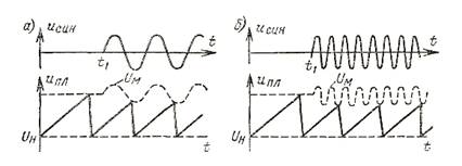 При увеличении напряжения синхронизации амплитуда пилообразного напряжения, а с ней и ширина линии развертки на экране уменьшаются. При чрезмерном синхронизирующем напряжении в отдельные моменты времени напряжение Uм может оказаться близким к напряжению Uн; это вызовет искажение формы кривой напряжения развертки, поскольку каждому периоду напряжения Uсин будут отвечать два или большее число импульсов пилообразного напряжения различных амплитуд и длительностей.
