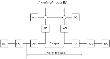 (ИС) тАУ источник сигнала. Преобразователи сигналов (ПС) на передающей и (ПС2) на приемной стороне. Преобразование низкочастотных сигналов в высокочастотные на передающем конце и обратное преобразование на приемном конце осуществляется в аппаратуре ВЧ уплотнения (АУ).