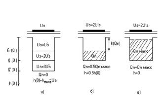 Приведенные зависимости позволяют наглядно проиллюстрировать работу ПЗС с помощью гидродинамической модели (рис.4, а-в). В этой модели потенциальная яма отождествляется с сосудом, зарядовый пакет Qn- с жидкостью, заполняющей этот сосуд, поверхностный потенциал, т.е. глубина потенциальной ямы,- с расстоянием h от поверхности жидкости, заполняющий этот сосуд, др верхнего края сосуда . В такой модели между объемом жидкости в сосуде и глубиной h (Qn) его незаполненной части существует линейная зависимость вида, а глубина пустого сосуда h(0) увеличивается пропорционально напряжению затвора. Эта модель используется для пояснения процесса переноса зарядного пакета.