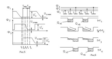 ВаВ момент времени t = t5 на шину Ф1 подается напряжение высокого уровня ( см. рис.5) и начинается перенос зарядовых пакетов Qn3 Ваи Qn6 в следующие элементы. Таким образом интервал времени tпер = t 4-t2 соответствуют времени, отводимому для переноса зарядовых пакетов, а интервал t xp= t 5тАУ t 4 тАУ времени хранения.