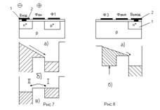 ВаРассмотрим устройство ввода электрического сигнала ( рис.7,а). Оно состоит из области 1 n+ - типа, которая образует с подложкой n+-p переход ( входной диод), входного омического контакта 2 к области 1 и входного затвора Ф вх. При простом способе ввода на вход подается сигнал отрицательной полярности, смещающий входной диод в прямом направлении, а к Ф вх прикладывается управляющее положительное направление. Наибольшее прямое смещение инжектирующего n+-p перехода обеспечивается в приповерхностной области, оно увеличивается с ростом разности напряжений на входе и на входном затворе. Зарядовый пакет инжектируется вначале из под n+- области под входной затвор ( рис.7, б), а затем переносится под первый затвор Ф1. Величина инжектируемого зарядового пакета увеличивается с ростом амплитуды входного сигнала по линейному ( приблизительно экспоненциальному ) закону. Кроме того, она зависит от времени инжекции, т.е. от тактовой частоты управляющих импульсов ( см. рис.5). Достоинство данного способа ввода электрического сигнала тАУ высокое быстродействие ( время инжекции составляет несколько наносекунд).