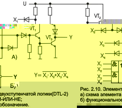 На рис. 1 приведена схема функционального элемента диодно-транзисторной логики, реализующая двухступенчатую функцию И-ИЛИ-НЕ. Реализация логической операции И и ИЛИ в микросхемах DТЛ-2 осуществляется на диодах, а операция НЕ выполняется на транзисторном усилителе-инверторе. Для увеличения логических возможностей по входам И и ИЛИ применяются специальные расширители функций И и ИЛИ.