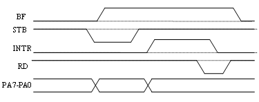 По переднему фронту импульса на линии STB A формируется сигнал BF (PC1) "буфер полон" который используется в качестве сигнала квитирования. По заднему фронту импульса STB A формируется сигнал INTR (PC0) который является сигналом прерывания.
