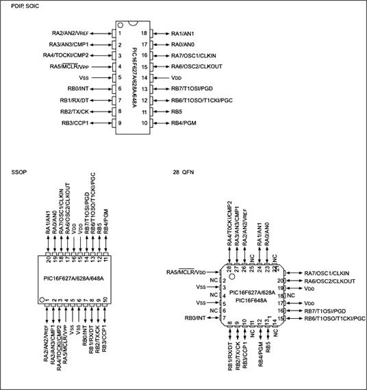 Рис. 2. Расположение выводов в различном исполнении микроконтроллеров PIC16F628А