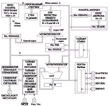 Рис. 3. Структурная схема ОМК PIC16F84 (16C84)