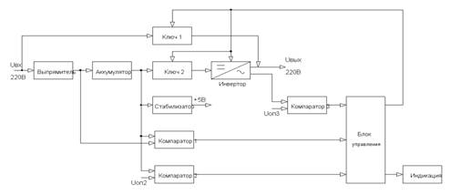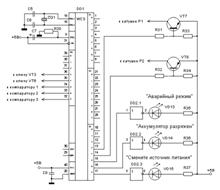 - блок управления тАУ обрабатывает управляющие сигналы с выходов компараторов и в зависимости от состояния компаратора 1 тАУ управляет ключами 1 и 2, переходя в аварийный режим работы и индикатором тАЬАварийный режимтАЭ; состояния компаратора 2 тАУ управляет индикатором тАЬАккумулятор разряжентАЭ; состояния компаратора 3 тАУ управляет индикатором тАЬСмените источник питаниятАЭ;