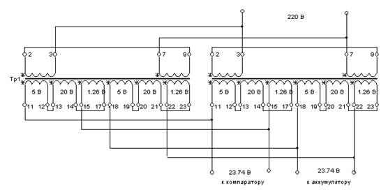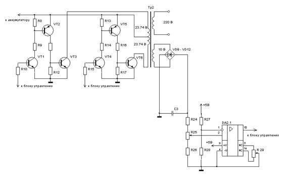 - выпрямитель тАУ включает в себя понижающий трансформатор и зарядное устройство для аккумулятора, величина выходного напряжения на выходе блока +29В;