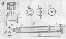 Центрировка зеркала или призмы в оправе может быть осуществлена различными методами. Простейший способ центрировки выполняется при помощи двух трубок I и II (рис. 7, a) без объективов и окуляров, ввинчиваемых в базовые резьбы 5 и 4 корпусов 3 и 5 призмы (рис. 5, а и в). Трубки имеют сетки А, В и С, находящиеся на конечных расстояниях от юстируемой призмы (или зеркала). Сетка 1 имеет черный кружок; па сетке 2 нанесено черное кольцо; сетка 3 имеет, также черное кольцо диаметром, промежуточным между диаметром чёрного кружка и кольцом сетки 2.
