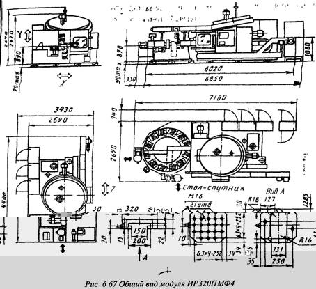 Схема компоновки ГПМ ИР320ПМФ4 (рис.16) включает одноименный станок с горизонтальным шпинделем, установленным в вертикально-подвижной шпиндельной коробке (ось Y) с продольно перемещающимся по оси Z ползуном. На верхнем торце стойки расположен 36-позиционный инструментальный магазин барабанного типа с наклонной осью вращения, обеспечивающий автоматическую смену инструмента в шпинделе без применения манипулятора. Поперечно-подвижный (ось Х) и поворотный (движение А) стол с вертикальным расположением рабочей поверхности с размерами 320x320 мм позволяет устанавливать и закреплять унифицированный стол-спутник с заготовкой, которая может быть обработана с четырех сторон за одну установку. Смена столов-спутников производится автоматически с накопителя, установленного перед станком и имеющего четыре (исполнение 1) или двенадцать (исполнение 2) позиций. Загрузка и разгрузка столов-спутников может осуществляться как вдоль продольной оси Z станка (с противоположной по отношению к шпинделю стороны), так и вдоль поперечной оси Х (перпендикулярно к оси шпинделя).