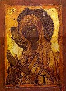 Первые иконы Богоматери в собственном смысле слова появляются, после Эфесского собора 431 года. Собор догматически утвердил за Марией право называться Богородицей, т.к. через рождение Иисуса от Св. Духа Мария участвует в тайне Боговоплощения. Несколько из ранних икон Богоматери были привезены с Синая в прошлом веке епископом и ученым Порфирием Успенским. На одной из них представлена Дева Мария с Младенцем Христом на коленях, сидящая на троне в окружении ангелов и свв. Федора и Георгия. Икона написана пастозно, в стиле позднеантичной живописи, но в ней уже есть и новые черты, не известные античности - особое внимание к лику, фронтальный разворот и жест руки Марии, указывающей на Младенца Христа [6, 45].