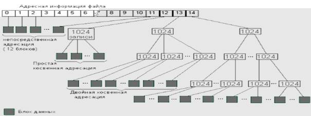 При максимальном размере блока в 4096 байт кластер, соответствующий 13-му полю, может содержать до 1024 номеров следующих блоков файла. Если размер файла превышает 12+1024 блоков, то используется 14-е поле, в котором находится адрес кластера, содержащего 1024 номеров кластеров, каждый из которых ссылается на 1024 блока файла. Здесь применяется уже двойная косвенная адресация. И наконец, если файл включает более 12+1024+1048576 блоков, то используется последнее 15-е поле для тройной косвенной адресации. Данная система адресации позволяет при максимальном размере блока в 4096 байт иметь файлы, размер которых превышает 2 TB.