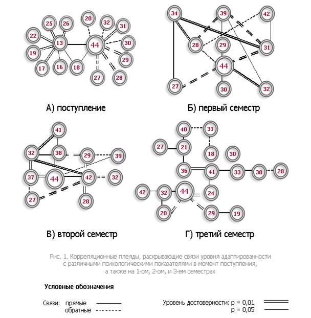 В качестве основного внутреннего и прямого критерия успешности адаптации курсантов к обучению в военном вузе выступала степень их адаптированности (высокая, средняя, низкая), определяемая, с помощью ранее названной методики Н.Н. Мельниковой. Внешними и косвенными критериями успешности адаптации выступали учебная успеваемость курсантов, их интеллектуальный и личностный потенциал, социально-психологический статус и их динамика в процессе обучения. Многократное изучение одних и тех же лиц в течение полутора лет и применение многомерного анализа дали возможность построить описание и интерпретацию полученных результатов по структурно-генетическому методу. [2]