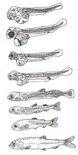 На 72 день развития (средняя температура тАУ 0,60С) возникает плавниковая кайма тАУ сначала вокруг хвостового отдела, а в дальнейшем вокруг всего тела эмбриона. Грудные плавники еще не имеют формы складки. Хорошо заметен зачаток печени, большой задний отдел кишечника. Происходит быстрое накопление пигмента на поверхности зачатка ретины и глаза делаются видны невооруженным глазом (рис. 4 е). пигментация туловища зародыша и желточного мешка начинается на 106 день развития (средняя температура 0,50С) при длине 6,2 мм. Крупные пигменты клетки звездчатой формы тАУ меленофоры тАУ в начале единично появляются в передней половине туловища и на ближайших тела участках желточного мешка. В дальнейшем их количество увеличивается и они располагаются вдоль всего тела в 2 ряда по верхнему и нижнему краю сегментов. В тоже время начинается образование зачатка хвостового плавника (происходит скопление мезенхимы в нижней части плавниковой складки). Образование зачатка спинного плавника происходит через 132 дня после оплодотворения икры (средняя температура 10С, сумма температур 142 0С). В это же время начинается пигментация головы и зародыша. Первая и вторая большие клетки появляются на затылочной части черепа. Число миотомов тАУ 58-60. Во всех отделах кишечника есть полость. Хорошо видны складки в зачатке желудка. Сердце пульсирует и можно наблюдать слабый прерывающий ток крови. К этому времени на голове и передней части желточного мешка сформированы железы вылупления. Непосредственно перед вылуплением у зародыша 60 сегментов. Диаметр желточного мешка 1,1-1,2 мм, т.е. за весь период эмбрионального развития его диаметр уменьшился примерно на 0,5 мм. На жаберных дужках начинают дифференцироваться жаберные мешки. При средней температуре за весь период инкубации 1,20С (сумма среднесуточных температур 165,40С). Массовое вылупление личинок происходит через 137 дней после оплодотворения икры (рис. 3 е).