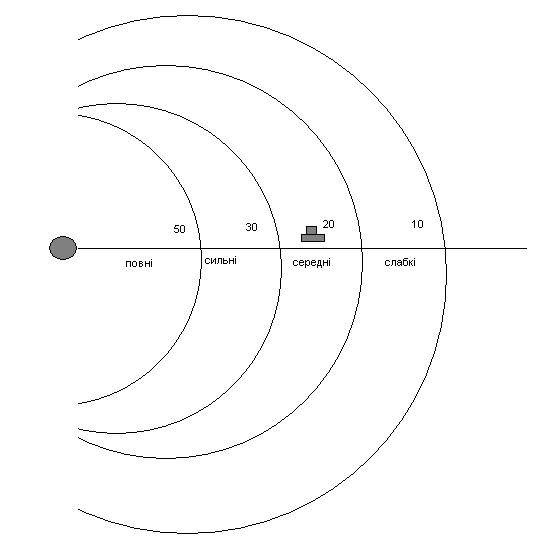 3. При надлишковому тиску ΔРфмах = 25,9 кПа, будiвлi (бетон) отримують слабкi руйнування, верстати тАУ середнi, трубопроводи на металевих естакадах, наземнi тАУ слабкi, кабельнi мережi, наземнi тАУ слабкi руйнування.