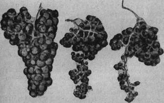 Рис. 3. Недостаток цинка у винограда. СправатАФмаленькие искоВнверканные ягоды и искривленныеВаВаВа кисти;Ва слева тАФ нормальная кисть.
