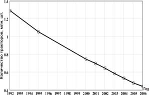 Проведя анализ статистических данных за последние 10 лет получен результат об уменьшении парка транспортных средств [6]. Так анализ изменения количества тракторов, используемых в сельском хозяйстве, представлен на рис.4.