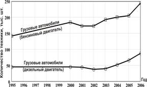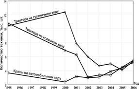 Уменьшение количества транспортных средств в организациях связано с падением производства автомобилей и тракторов в 90-х годах, а также вследствие старения парка автотракторной техники (соотношение поступивших и выбывающих тракторов составляет 1:5). Данные по изменению производства техники представлены на рис.5 и 6.