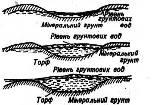 Озернi болота утворюються внаслiдок заростання озера болотною рослиннiстю з одночасним накопиченням на днi рослинних решткiв. Процес заростання розпочинаiться вiд берегiв (рис. 2). До глибини 1 м переважаi осока, глибше (1тАУ2 м) тАУ рогоза та очерет, на глибинах до 4тАУ5 м тАУ водянi лiлii. В осiннiй перiод внаслiдок вiдмирання рослин на днi утворюються рослинний мул та торф, який за складом вiдповiдаi названим вище рослинам. Утворення шару торфу сприяi обмiлiнню озера та, вiдповiдно, розширенню дiлянки розростання тих або iнших рослин, тобто просуванню зони заростання до середини озера. Коли зони з'iднуються, озеро перетворюiться на болото.