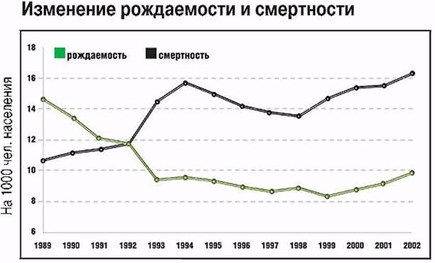 Превышение смертности над рождаемостью связано с ухудшением социально-экономических усВнловий в связи с рыночными преобразованиями в экономике, снижением уровня жизни большей части населения России, продолжением старения населения, иммиграционными процесВнсами, возросшей потерей населения трудоспособного возраста: Алания, Ингушской Республике, Краснодарском и СтавроВнпольском краях, Ленинградской, Псковской, Калужской, ТверВнской, Белгородской, Самарской, Волгоградской, Астраханской и Калининградской областях. В них сальдо миграции в 2,5тАФ3 раза выше среднего показателя по России и составляет от 142 до 107 чел. на 10 000 жителей при среднем росте мигрантов по стране 42 чел.