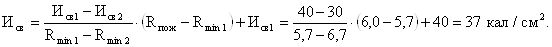 При Rmin1=5,7 км, Исв1= 40 кал/см2, а при Rmin2=6,7 км, Исв2=30 кал/см2. Интерполируя находим, что